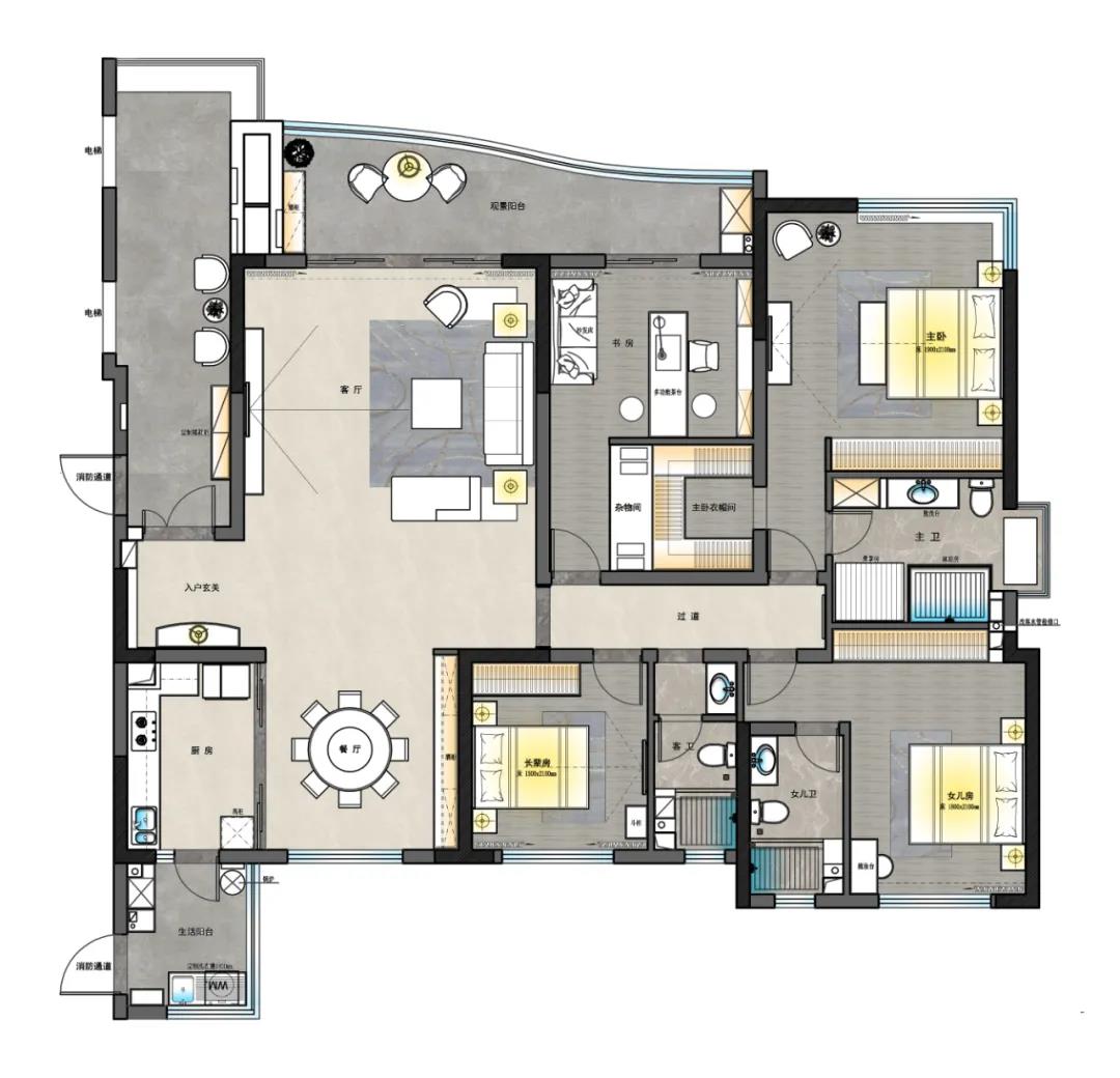 本案戶型方正,立于布局與設(shè)計(jì)。超大會(huì)客廳奢華大氣,兩個(gè)大型觀景陽臺(tái)貼近自然,風(fēng)光盡攬。生活陽臺(tái)與廚房連為一體,擴(kuò)寬使用空間。主臥配備衣帽間與獨(dú)立衛(wèi)生間,滿足客戶梳洗和更衣之用。