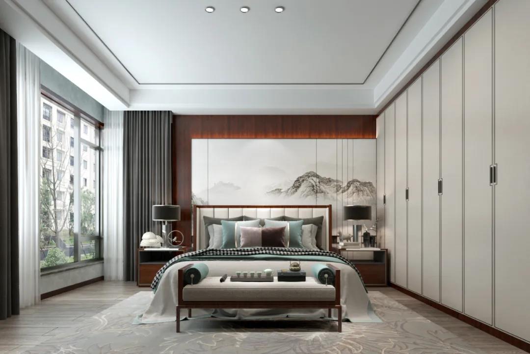 臥室整體去除復(fù)雜的設(shè)計(jì)元素,精準(zhǔn)提煉最能表達(dá)風(fēng)格的顏色,以灰綠、灰白、米色等低飽和度的色調(diào)進(jìn)行搭配,打造出素雅簡(jiǎn)潔、又頗有中式風(fēng)韻的休憩空間。