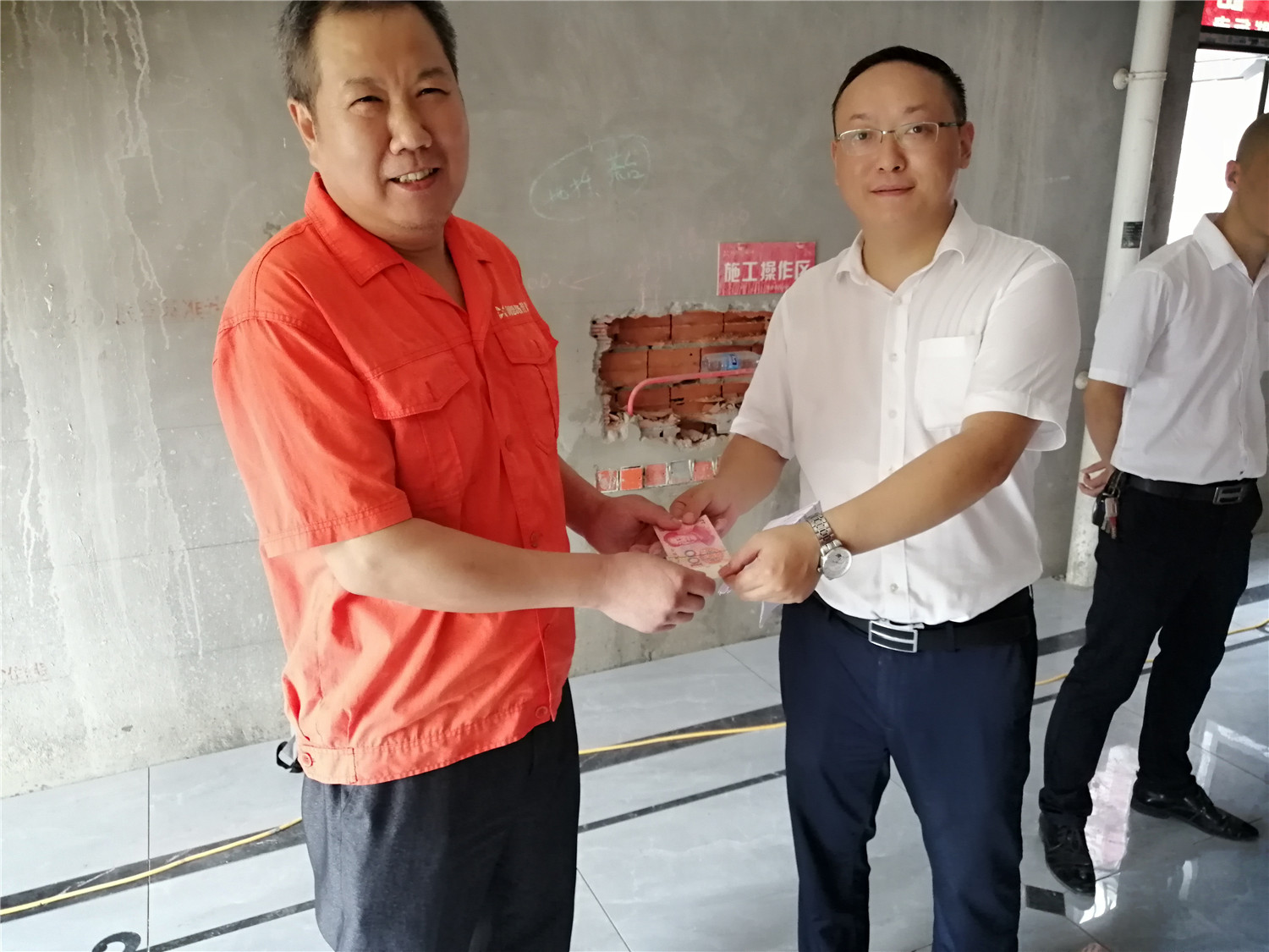 文經(jīng)理給問題回答正確的工人現(xiàn)場發(fā)放現(xiàn)金獎勵