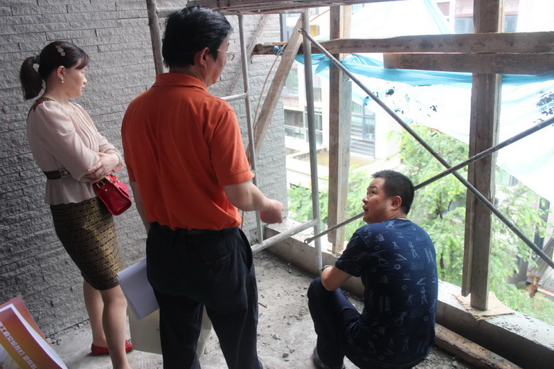設(shè)計(jì)師、業(yè)主、工長(zhǎng)三方商討樓梯間的改造方案。