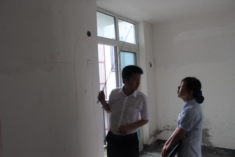 工程質(zhì)檢正在仔細(xì)檢查墻體有無(wú)空鼓情況。