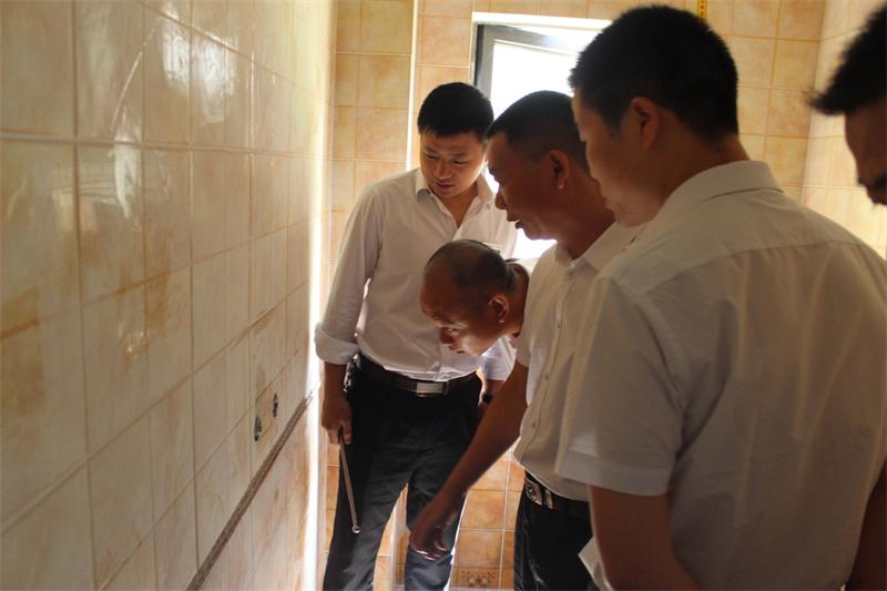 巡查成員正在仔細(xì)檢查衛(wèi)生間給水管施工情況