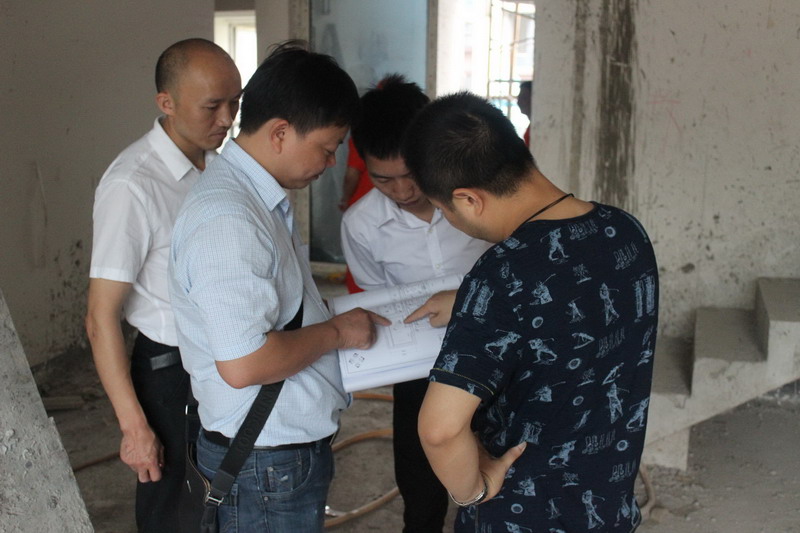工長(zhǎng)和工人師傅對(duì)照?qǐng)D紙,認(rèn)真討論電線的排版、走位;插座組數(shù);強(qiáng)弱電箱安裝位置等細(xì)節(jié)。