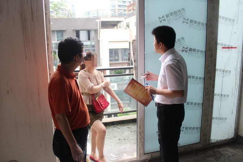 質(zhì)檢正在向潘老師夫婦介紹公司施工管理和服務(wù)的標(biāo)準(zhǔn)。新思路裝飾一直堅(jiān)持“客戶滿意是唯一的工作標(biāo)準(zhǔn)”,努力踐行“裝修做客戶口碑”的理念,致力為每一位客戶提供高品質(zhì)的工程質(zhì)量和裝修服務(wù)。