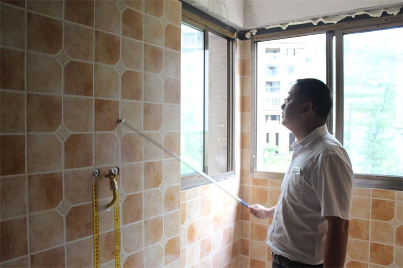 文經(jīng)理正在認(rèn)真檢查墻磚鋪貼情況